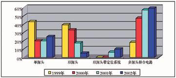 圖1 所示從1999年到2002年(2002年的數(shù)據(jù)是由上半年數(shù)據(jù)推算而來)單探頭、雙探頭、雙探頭帶定位系統(tǒng)和多探頭符合線路,四種不同核醫(yī)學(xué)設(shè)備每年各種類型所占比例。可以看出。最為明顯的是普通雙探頭在2002年僅僅占總數(shù)的5%,普通單探頭占總數(shù)25%,多探頭帶符合電路系統(tǒng)占總數(shù)59%。普通雙探頭帶X線定位系統(tǒng)占總數(shù)10%。可以看出單探頭SPECT和多探頭符合電路系統(tǒng)呈增長趨勢,尤其以多探頭符合電路系統(tǒng)更為明顯。