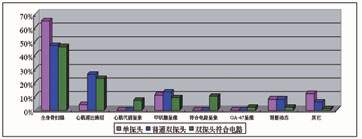 圖2 從2001年7月-2002年6月調(diào)研10家單探頭用戶、5家普通雙探頭用戶和30家雙探頭可變角度帶有符合電路用戶臨床檢查類型的數(shù)據(jù)。為了便于比較,采用相對(duì)數(shù)的方法。可以看出對(duì)于單探頭用戶在臨床主要用于骨掃描和甲狀腺檢查。對(duì)于雙探頭帶有符合電路系統(tǒng)的用戶,骨掃描46%、心肌血流灌注23%、符合電路10%、甲狀腺9%、心肌代謝7%、GA-67為2%,其它(腎臟、肝等)3%。可以看出雙探頭符合電路系統(tǒng)最大的貢獻(xiàn)是為臨床開拓出20%新的檢查項(xiàng)目,最為重要的是這些檢查項(xiàng)目將成為主流臨床檢查。這可能是雙探頭(多探頭)符合電路在國內(nèi)急劇增加的主要原因。